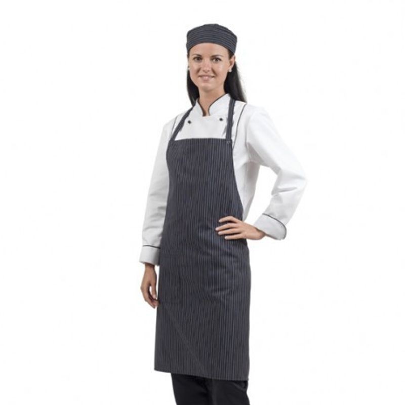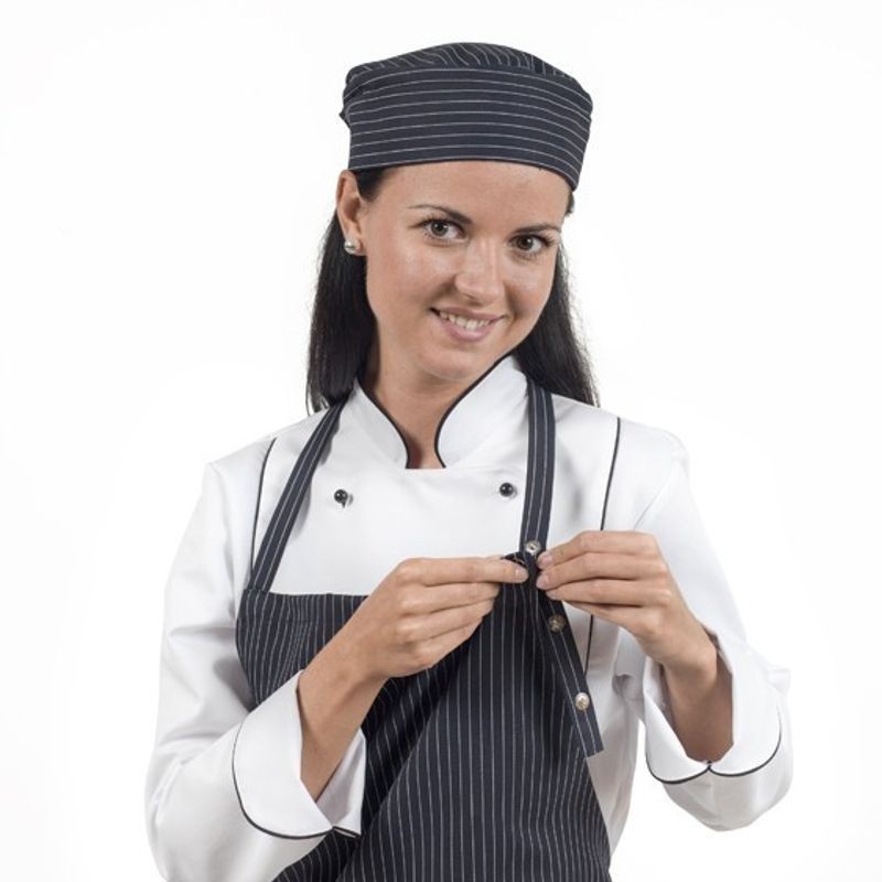 Kuchárska zástera s cvokmi, vytkávaný čiernobiely prúžok, 90x90 cm, 65% polyester / 35% bavlna, pranie na 60°C.
