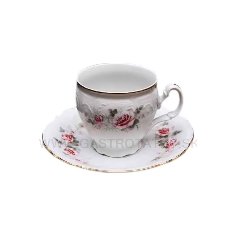Karlovarský porcelán - Šálka s podšálkou mokka 115 Bernadotte šedo-ružový kvet zlatá linka. Nie je vhodné do mikrovlnnej rúry, ani do umývačky riadu.