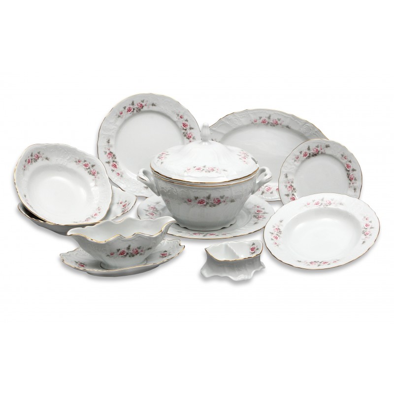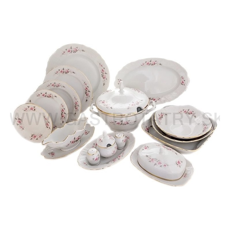 Obsahuje: 1x misa polievková s vekom 2,5 l, 1x omáčnik s podšálkou, 1x misa kompótová 25 cm, 1x misa kompótová 23 cm, 1x misa oválna 34 cm, 1x misa plytká 30 cm, 6x tanier plytký 25 cm, 6x tanier hlboký 23 cm, 6x tanier dezertný 19 cm, 1x soľnička-korenička 2 dielna