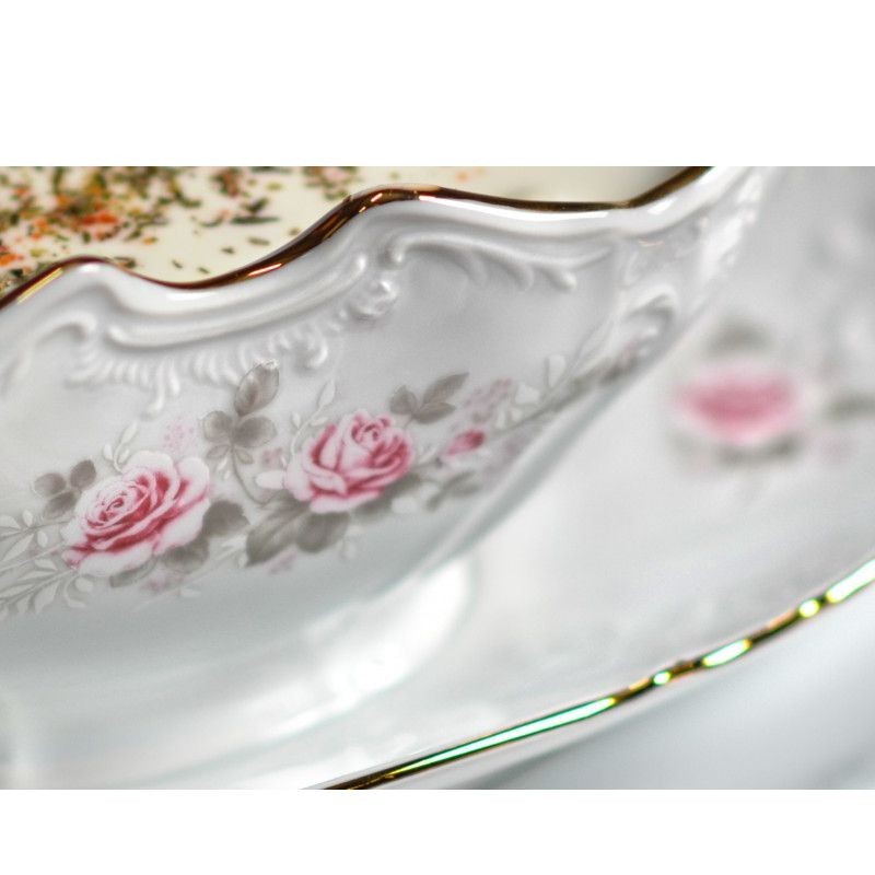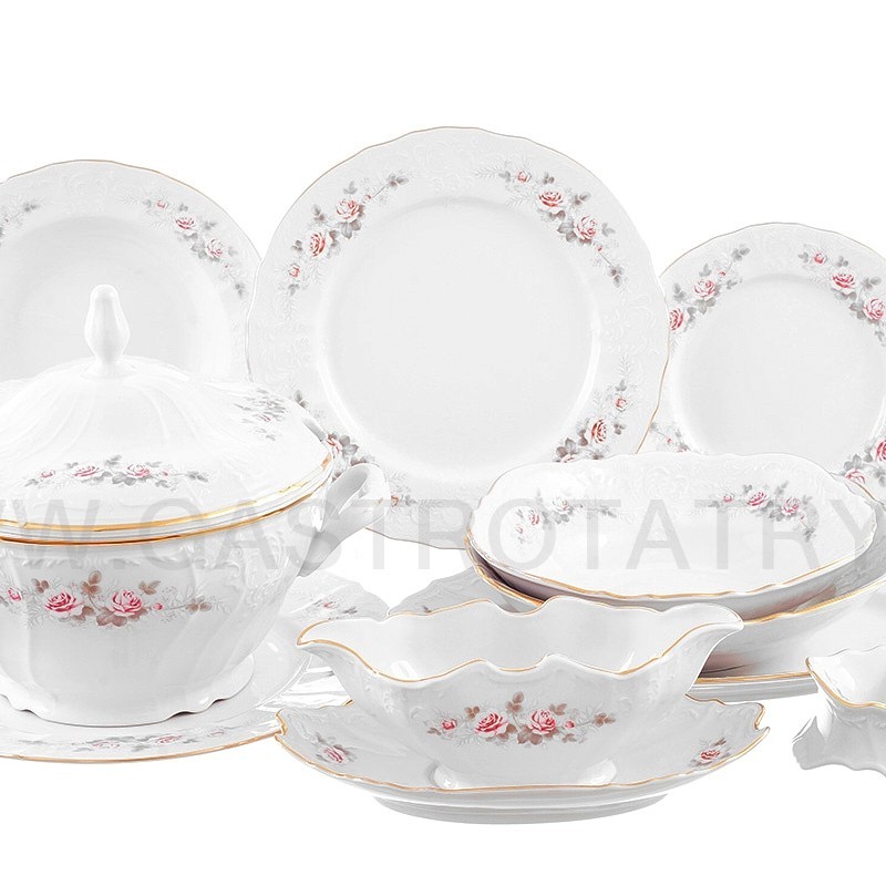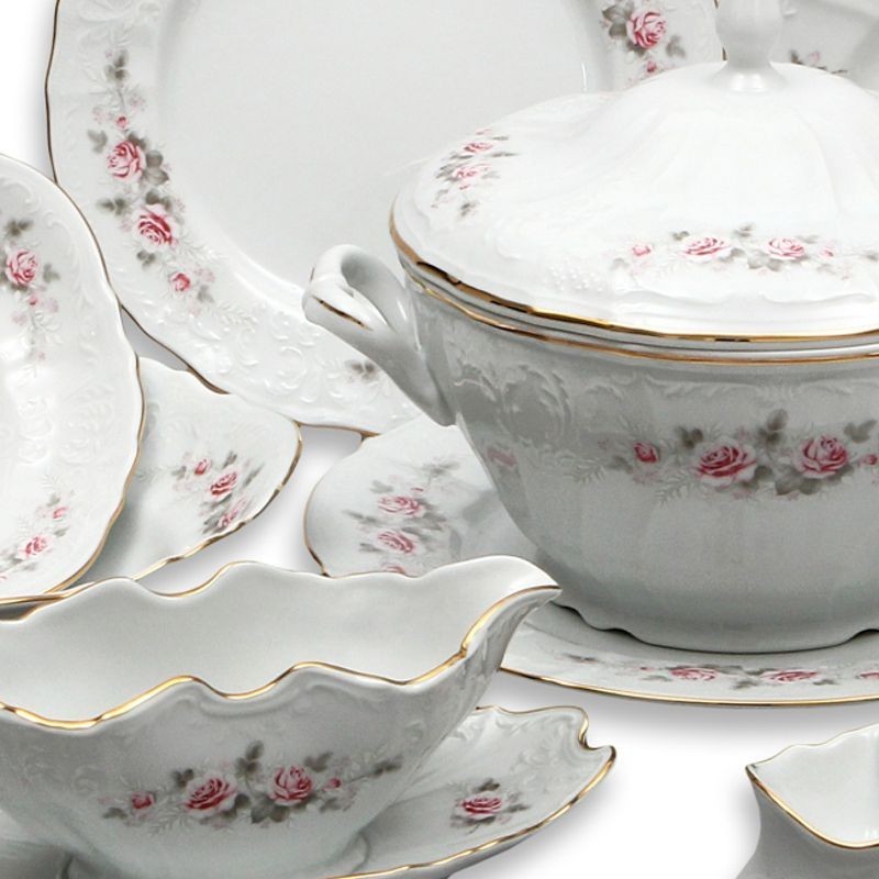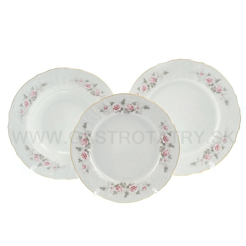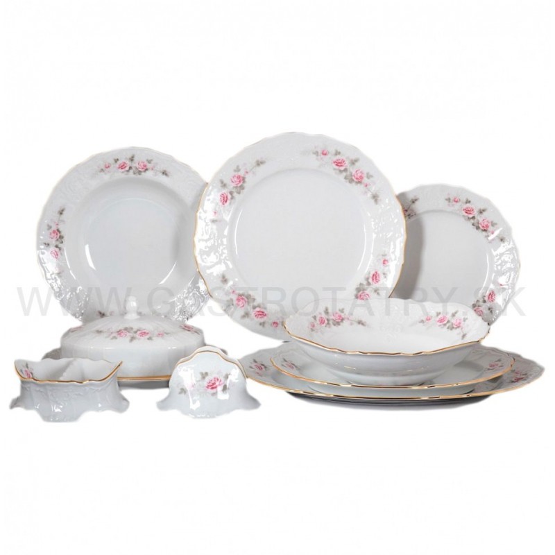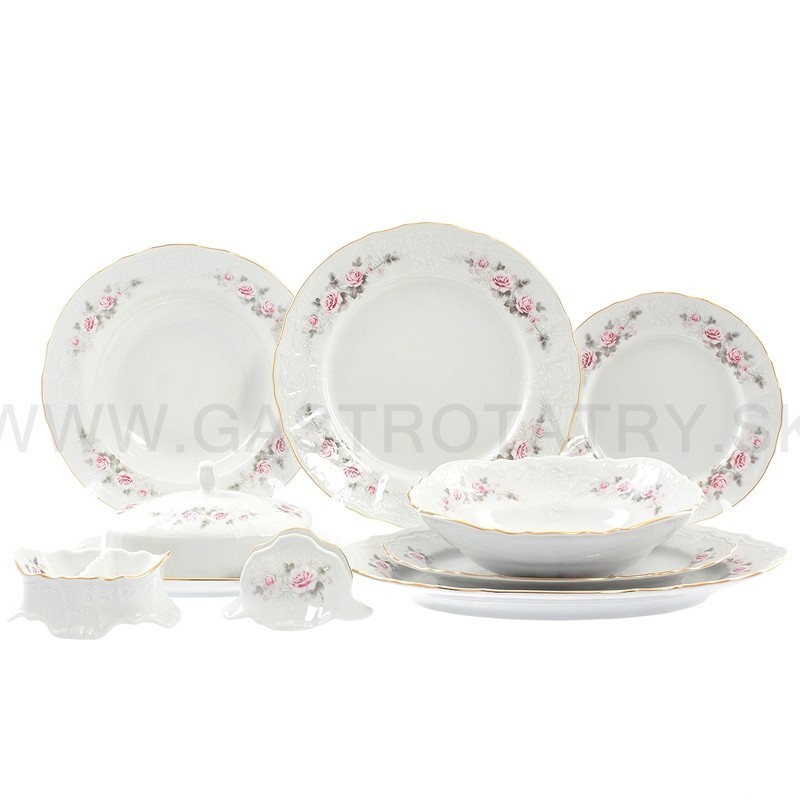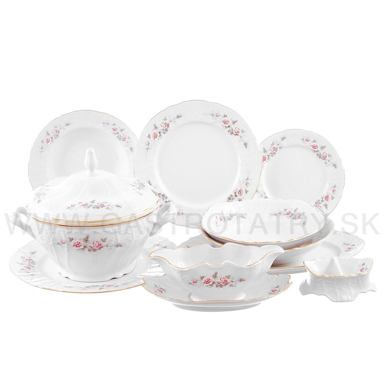 Karloovarský porcelán BERNADOTTE šedo-ružový kvet + zlatá linka obedová súprava 26 dielna.